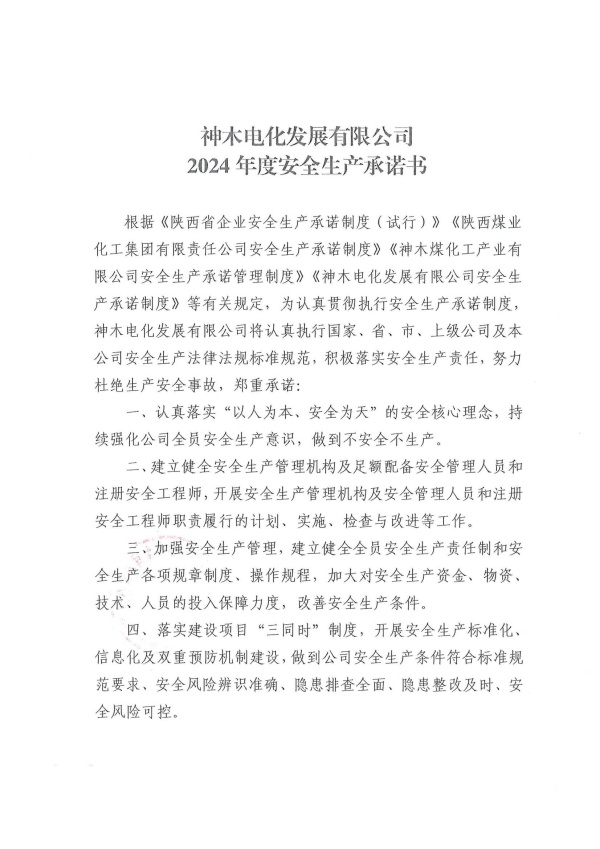 神木电化发展有限2024年度安全生产承诺书
