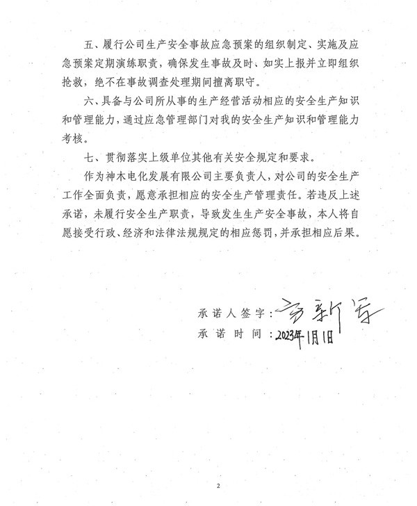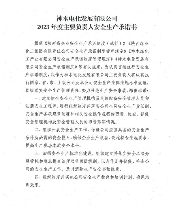 神木电化发展有限2023年度主要负责人安全生产承诺书